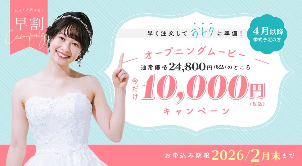 2026年4月以降に商品お受け取り・挙式予定のお客様にむけて、2月末までにプロフィールムービーを注文するとオープニングムービーを限定価格10,000円(税込)でつけられるキャンペーンです。プロフィールムービーとオープニングムービーを注文するとセット割引通常価格49,600円(税込)が早割適用で39,800円に。またプロフィールムービーとオープニングムービー+エンドロールでセット割引通常価格69,600円(税込)が早割適用で59,600円になります。