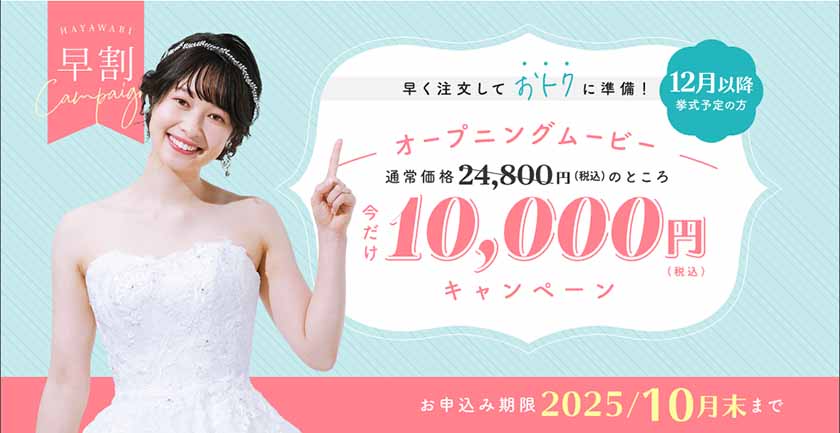 2025年12月以降に商品お受け取り・挙式予定のお客様にむけて、10月末までにプロフィールムービーを注文するとオープニングムービーを限定価格10,000円(税込)でつけられるキャンペーンです。