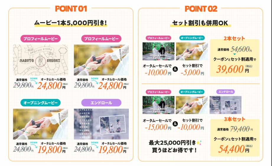 プロフィールムービーとオープニングムービーを注文するとセット割引通常価格49,600円(税込)が39,800円に。またプロフィールムービーとオープニングムービー+エンドロールでセット割引通常価格69,400円(税込)が59,600円になります。