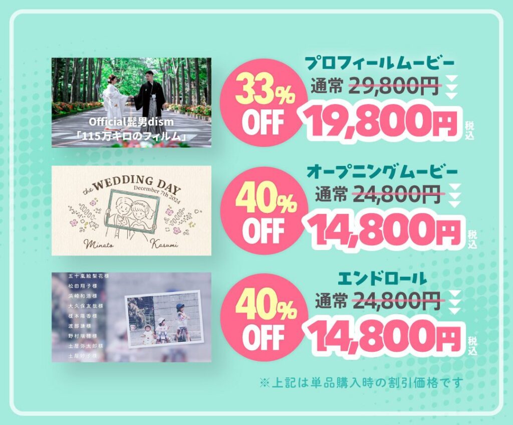 プロフィールムービー、オープニングムービー、エンドロールがもれなく、定価から5,000円OFF 。
