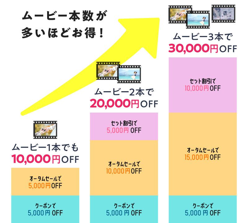 プロフィールムービー、オープニングムービー、エンドロールがもれなく、定価から5,000円OFF 。3本セットで購入すると最大25,000円もお得になります♪