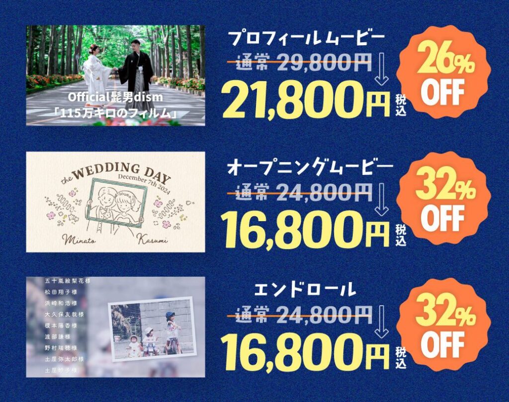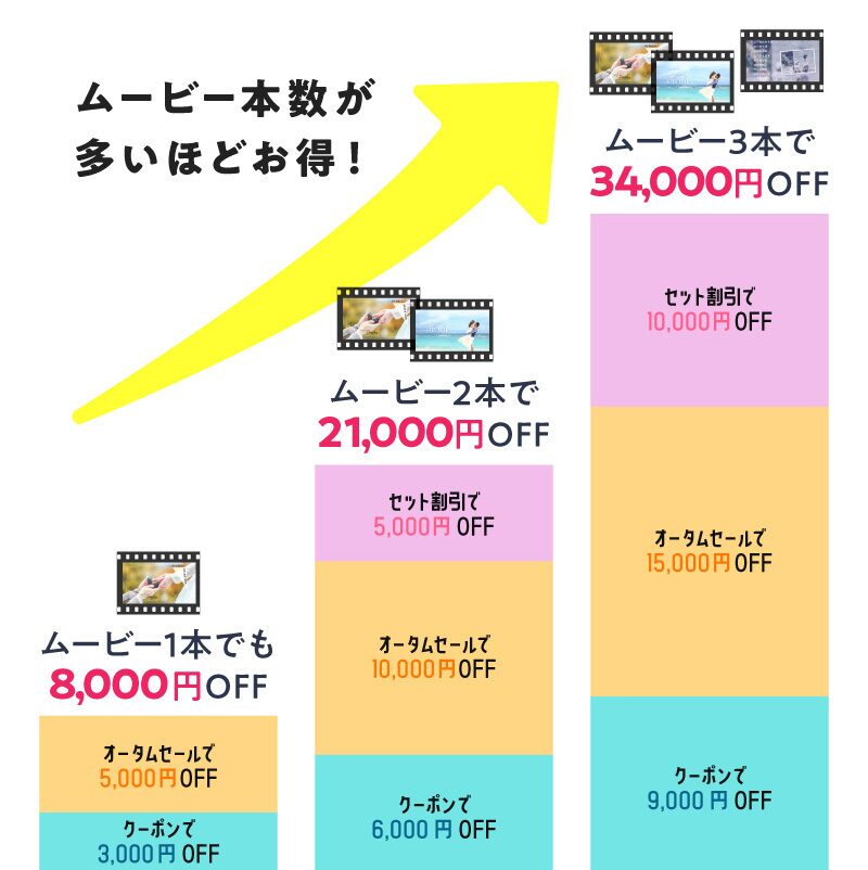 プロフィールムービーに、オープニングムービー、エンドロールと3本購入すると最大34,000円OFFとなります。