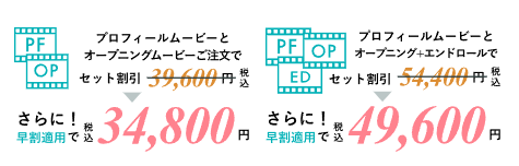 プロフィールムービーとオープニングムービーを注文するとセット割引通常価格49,600円(税込)が39,600円に。またプロフィールムービーとオープニングムービー+エンドロールでセット割引通常価格69,400円(税込)が54,400円になります。