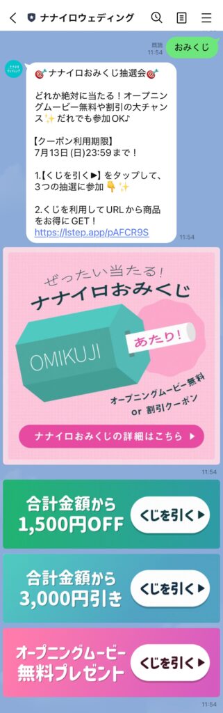 現在、ナナイロウェディングの公式アカウントに登録すると、1,000円OFFのクーポンがもらえるだけでなく、LINEのお友だち限定のクーポン配布や特別なキャンペーン情報が定期的に配布されます。
