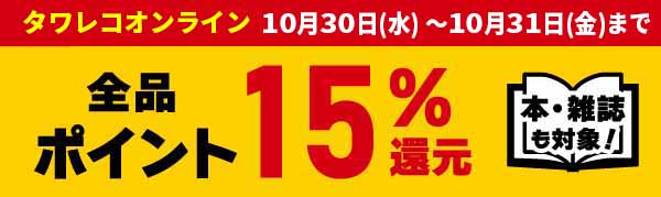 タワーレコードオンライン(TOWER RECORDS ONLINE)では10月30日(木)~10月31日(金)の2日間、本・雑誌も含む全品15%ポイント還元のキャンペーンを開催しています!注文したCD、DVD、グッズ、書籍すべてがポイント還元対象です! 気になっていたアイテムや高額商品、新作の予約も期間中のご注文が絶対にお得なキャンペーンです。